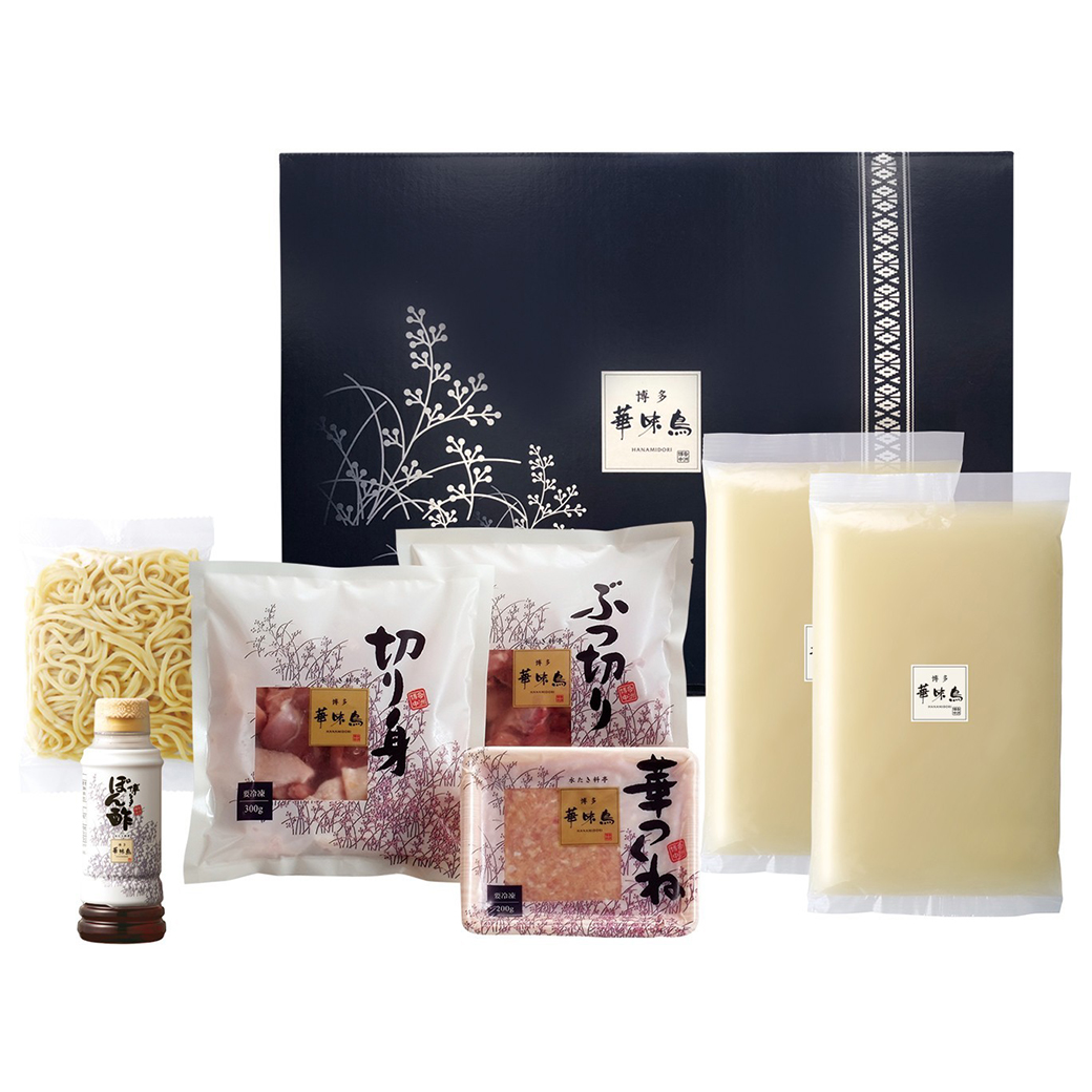 【季節商品のため在庫がなくなり次第終了】 水たき生スープ 600g×2、華味鳥 切り身 300g×1、華味鳥 ぶつ切り 300g×1、華つくね 200g×1、博多ぽん酢 220ml×1、ちゃんぽん麺 150g×1