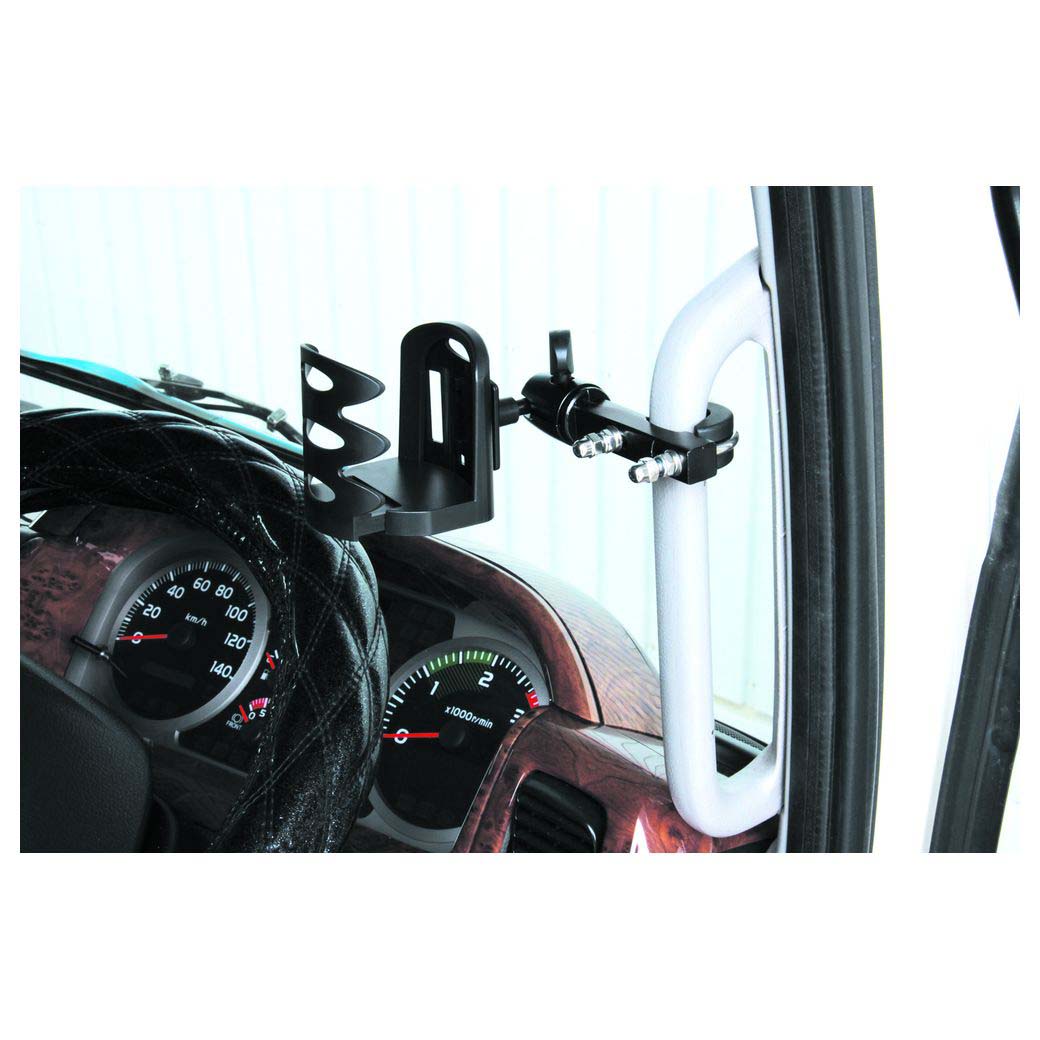 サイズ:55~70mmまでのカップ灰皿等が収納可能 カラー:ブラック 材質:ステー/アルミ、ステンレス、ホルダー/樹脂 規格:約20~25mm太さのアシストグリップに対応