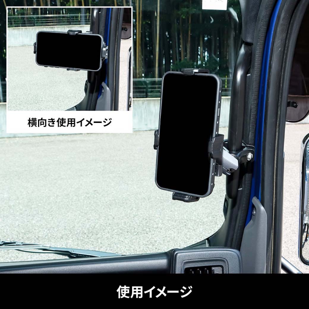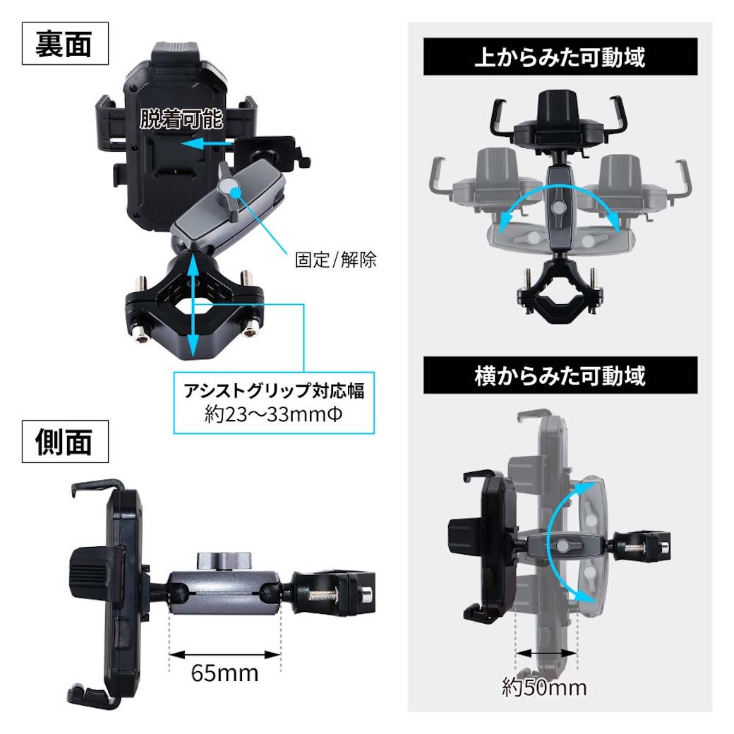 アシストグリップにガッチリ固定して、好きな角度に調整して使用できるスマホホルダー。取付位置から上のほうに、下の方に、横へなど、スマホの向きもタテ置きヨコ置きと好きなように固定できます。スマホのホールド部分はヨコ65~90mm、タテ115~170mmまで幅広く、ワンタッチ取付けのプッシュボタンタイプ。
