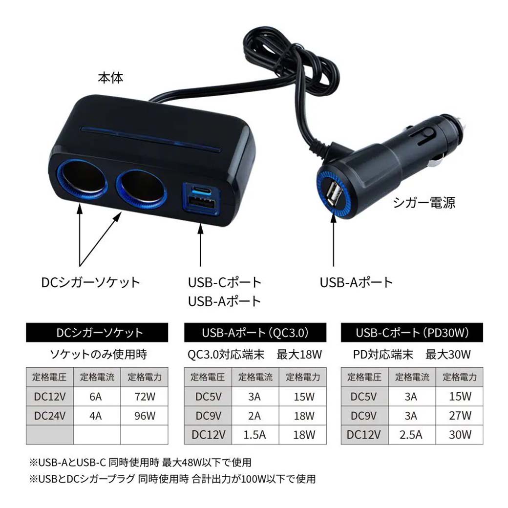 ※電圧変換機能はありません。シガー電源の場合ご使用の車両の電圧がそのまま出力電圧となります。(USB電源は5Vに変換)