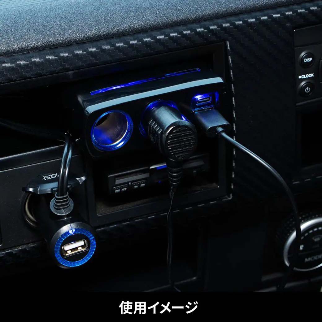 シガー電源部にもUSB-Cタイプを装備。計5か所の同時使用が可能です。起動時LED(ブルー)点灯。