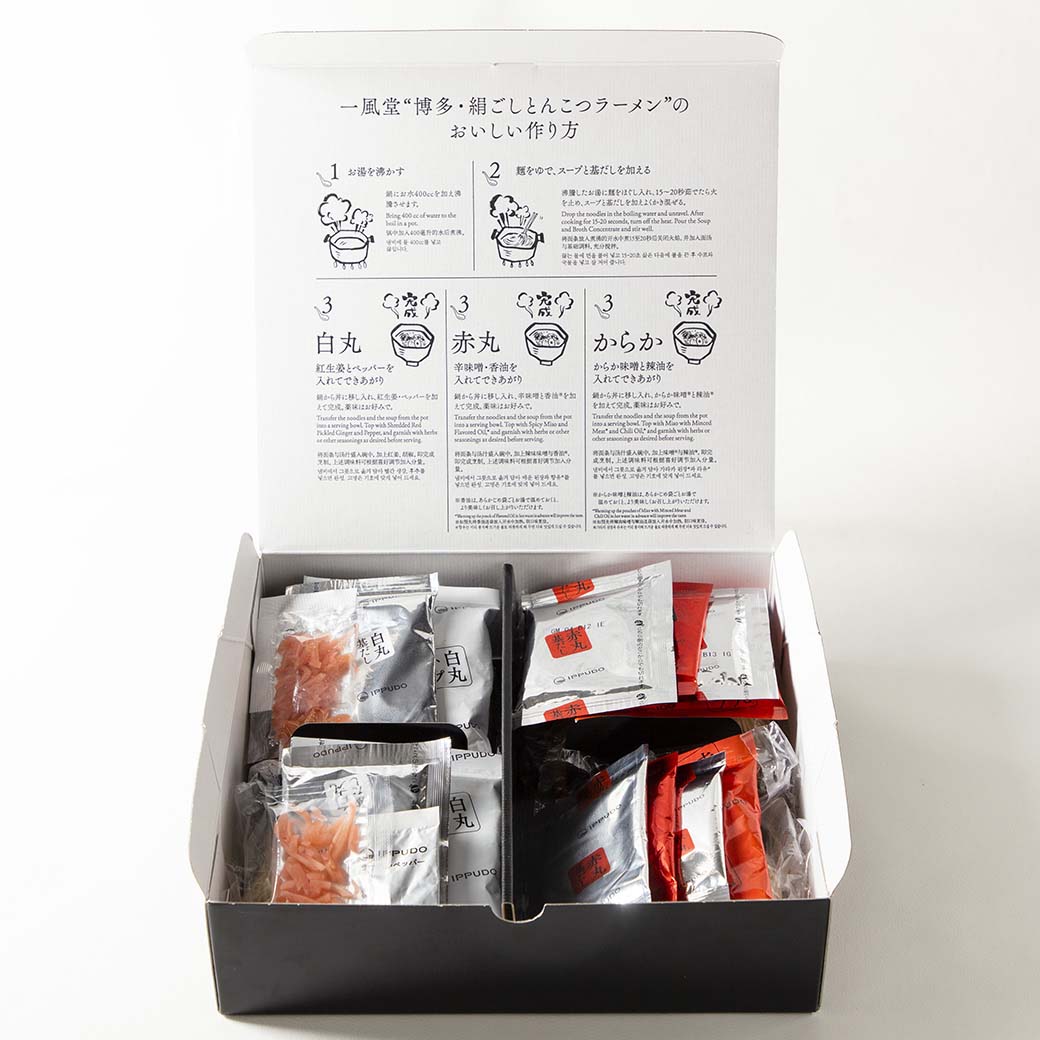 ・白丸2食(170.35g/ 麺100g、スープ46g、基だし20g、紅しょうが4g、ペッパー0.35g) ・赤丸2食(180g/麺100g、スープ50g、基だし22g、辛味噌7g、香油5g)