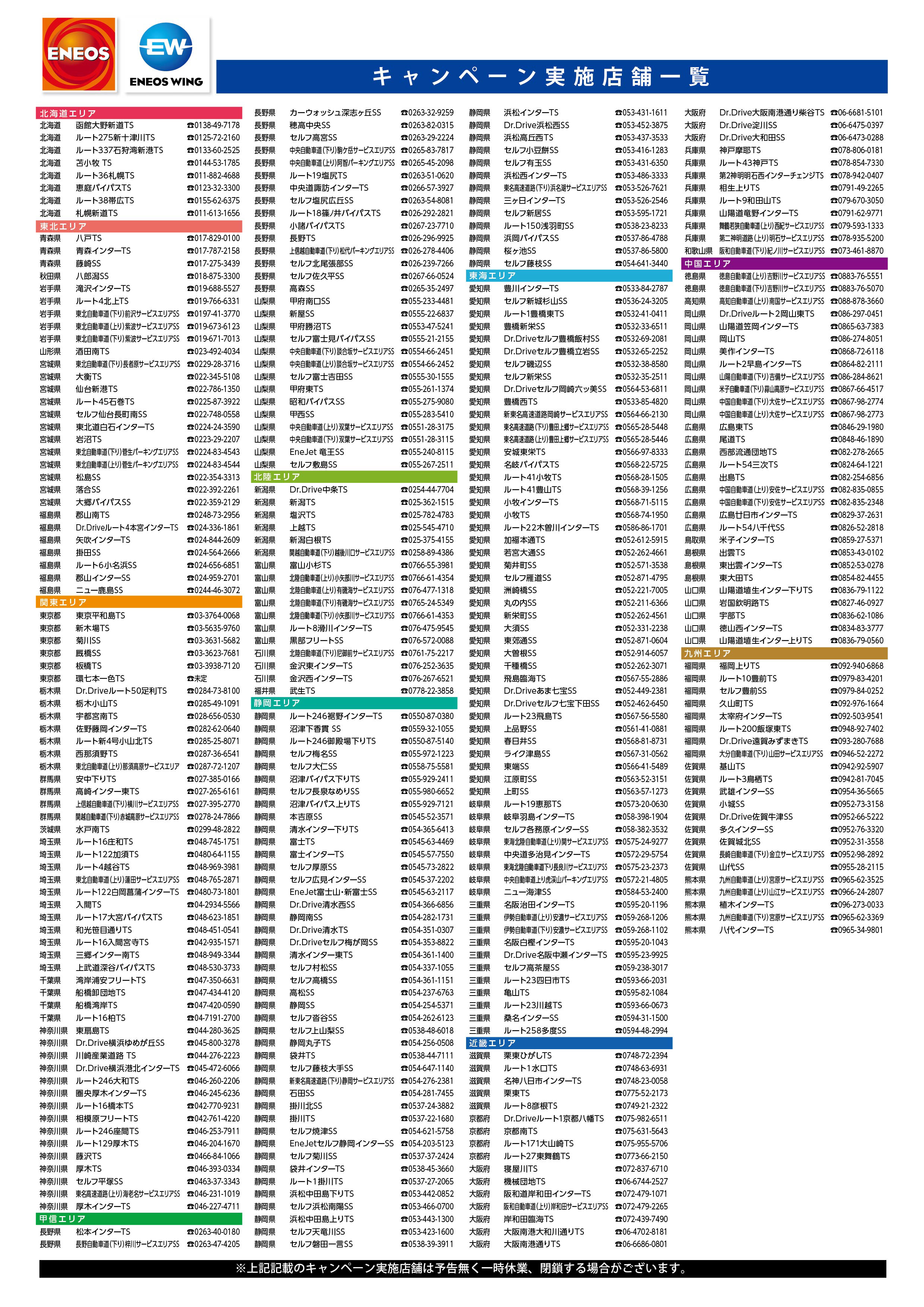 キャンペーン対象店舗はENEOSウイングの直営店と一部特約店となります。代行店舗はキャンペーン対象外となりますのでご注意下さい。